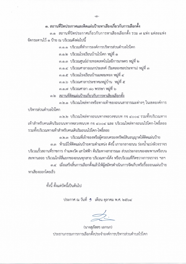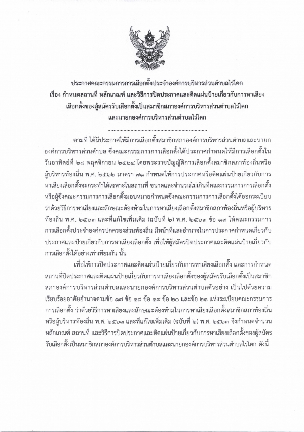 กำหนดสถานที่ หลักเกณฑ์ และวิธีการปิดประกาศและติดแผ่นป้ายเกี่ยวกับการหาเสียงเลือกตั้งของผู้สมัครรับเลือกตั้งเป็นสมาชิกสภาองค์การบริหารส่วนตำบลไร่โคก และนายกองค์การบริหารส่วนตำบลไร่โคก