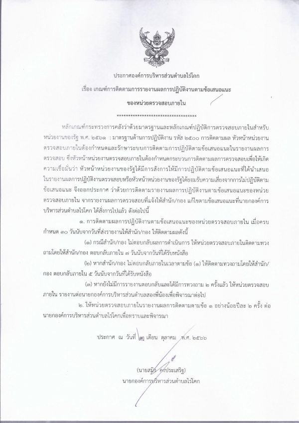 ประกาศเกณฑ์การติดตามการรายงานผลการปฏิบัติงานตามข้อเสนอแนะของหน่วยตรวจสอบภายใน